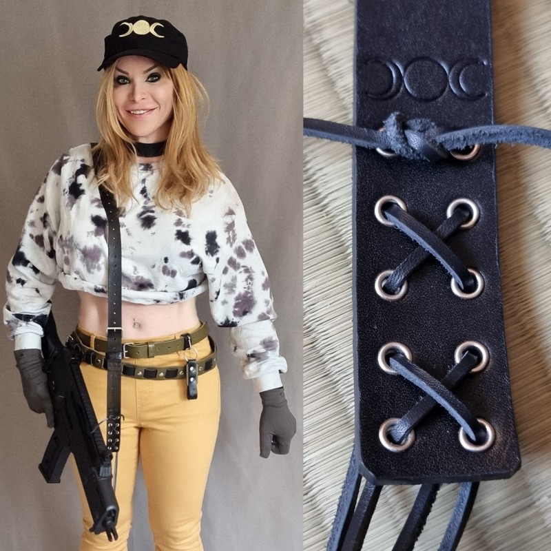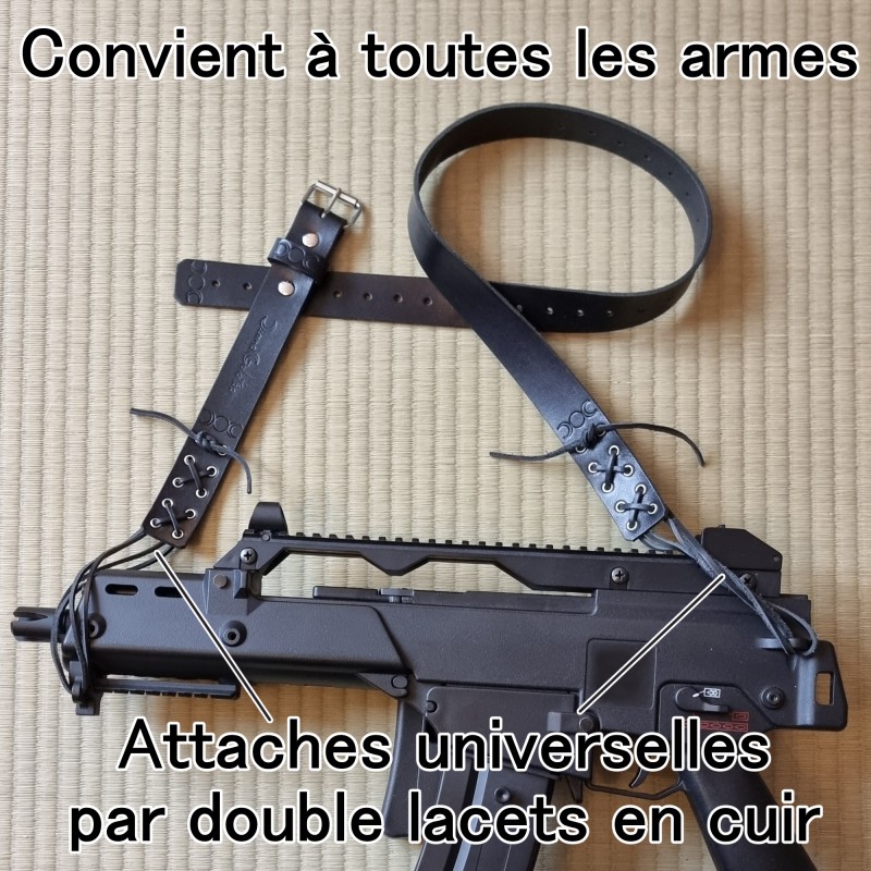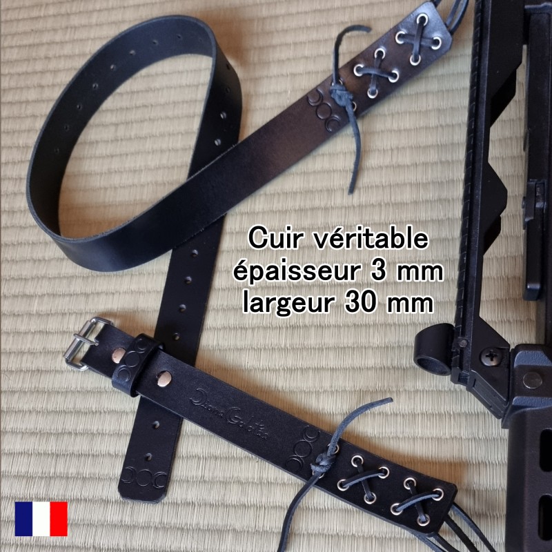 N'oubliez pas de sauvegarder votre personnalisation pour pouvoir l'ajouter au panierBandoulière universelle pour fusil léger en cuir véritable. Convient à toutes les armes. La bandoulière est composée d'une bande de cuir de 3 mm d'épaisseur et 30 mm de large. la longueur utile de la bandoulière est de 1m30 maximum et de 0m90 minimum. Les attaches, par lacets en cuir, par double boucles, offrent une souplesse inégalée dans le maniement de l'arme associée.