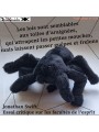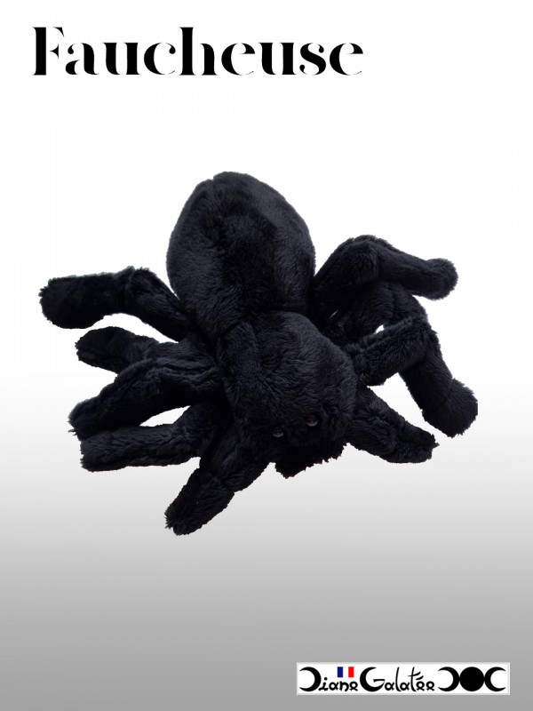 Very soft, all black, this spider will quickly become attached to you. It has eight legs to stand up and two eyes to look at you tenderly.