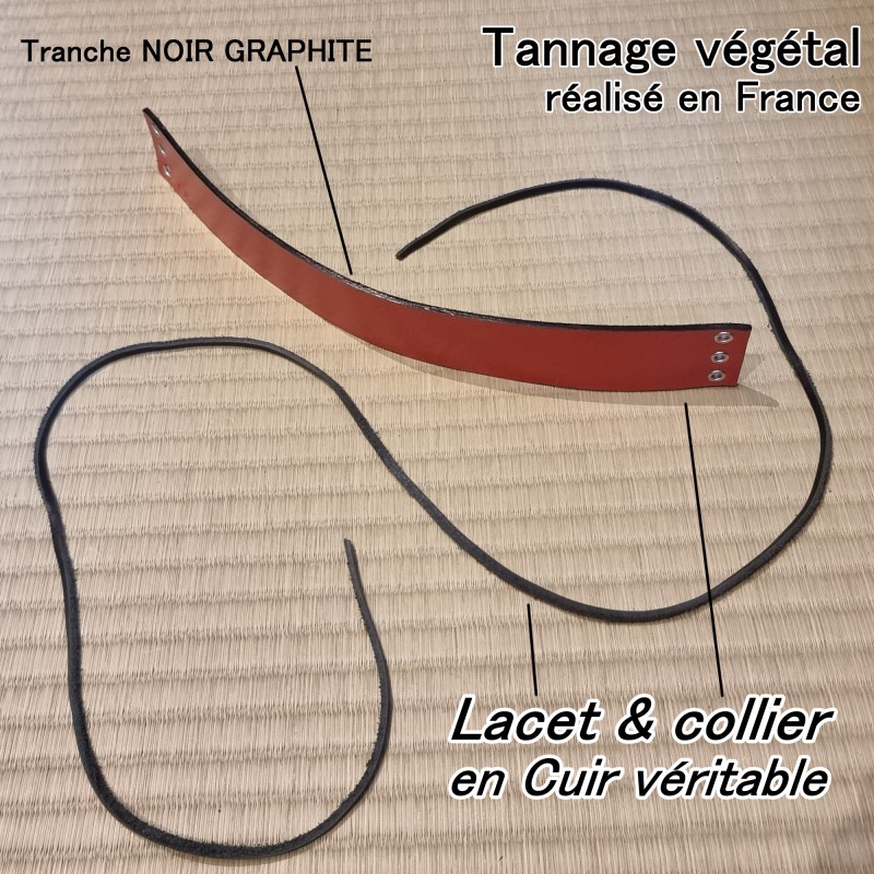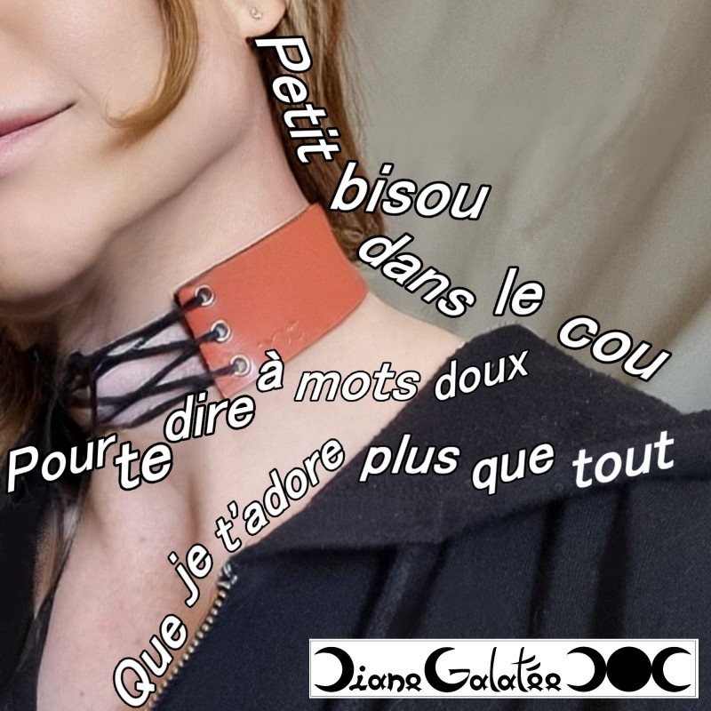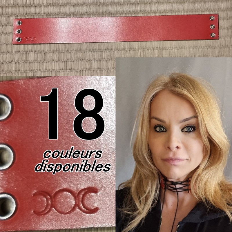 Don't forget to save your customization to be able to add to cartReal leather choker necklace with a thickness of 3 mm and a width of 40 mm. Available in our 18 brand colors. All our pieces are made to measure. Our leathers come from France and are produced using environmentally friendly vegetable tanning. Our carnations come from the Netherlands. The collar is made of natural leather in the color of your choice. The lace is also made of black leather, waxed by hand. The necklace can be worn with lacing from the front or back. In the context of a back lacing, the collar will have the appearance of a choker.